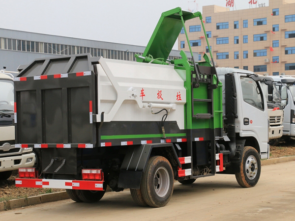 該車箱體有效容積:5立方,箱體前部側(cè)面帶有掛桶提升機構(gòu),可自動舉升垃圾桶倒入垃圾,帶自卸功能,尾部裝有橡膠密封條,防污水滴漏,杜絕二次污染。掛桶垃圾車可根據(jù)客戶要求搭配120升或240升塑料桶和鐵桶。