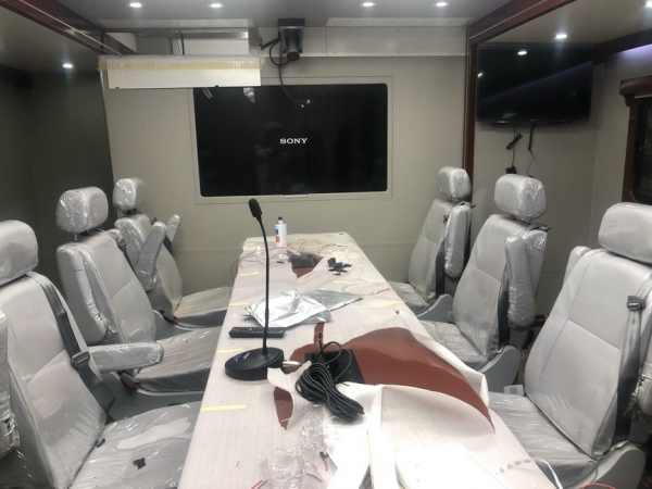 工作區(qū)前與駕駛區(qū)隔斷。安裝會(huì)議臺(tái)與兩側(cè)沙發(fā)。并在前隔斷板后加裝機(jī)架,機(jī)架依據(jù)實(shí)際設(shè)備參數(shù)訂制,以安全耐用,方便查看為
