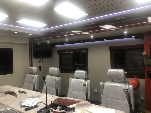 多功能應(yīng)急搶險(xiǎn)救援指揮車(chē)是采用東風(fēng)天錦、重汽豪沃、進(jìn)口奔馳等底盤(pán)上進(jìn)行改裝,能同時(shí)容納 7~10 人開(kāi)會(huì),辦公。改裝后安裝了衛(wèi)星通信系統(tǒng);音視